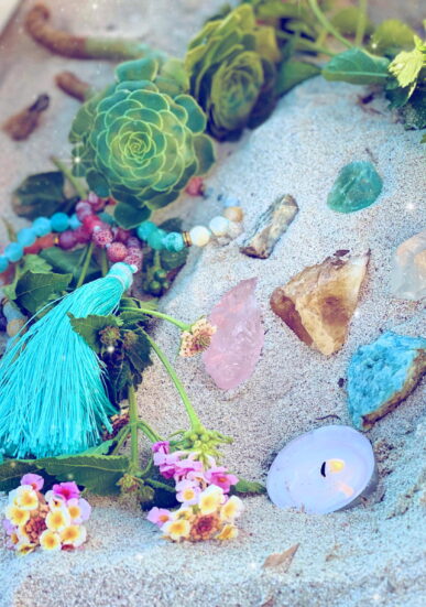 Tworząc kręgi kobiet, rytuały układania mandal kwiatowych oraz pracą 4 żywiołami.
